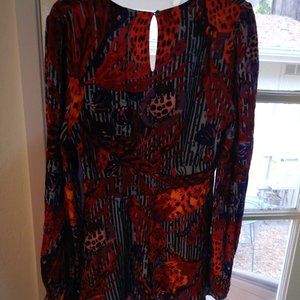 Size 6 romper. Long flowy sleeves. Beautiful pattern. Low V neck in front. One button closure in back.