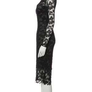 ML Monique Lhuillier black lace body con dress. Open back, high collar. Lace is in perfect condition. Small pull on the lining that is not visible when worn (on the lining that would touch your body). Excellent used condition