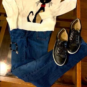 These jeggings are incredible! They’re from Levi’s, so you know they’ll retain their shape. They’re done in a dark wash, and measure 16 inches through the waist, with a 9-inch rise (mid). The inseam is 29 inches long. (The sweater from Delia’s is also sold in my closet). They’re in excellent condition, with no flaws.