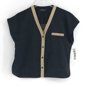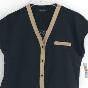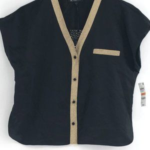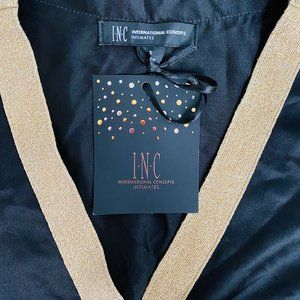 Brand new with tags. Black with gold metallic trim pajama lounge top. Features a v-neckline with a button front closure of matching black buttons. First photo is for modeling purposes only and does NOT reflect the item for sale.