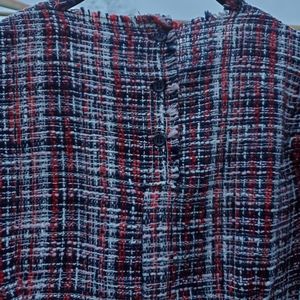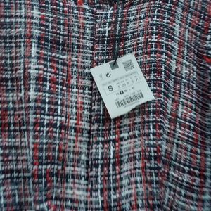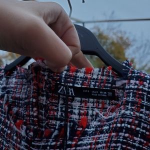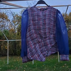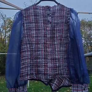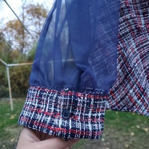 NWT Zara blous with sheer sleeves and cuff accents on the wrists. Colors are quite closer to true red and deep blue im sorry it was hard to capture in pictures but these are all unedited in natural lighting. Button up is on the backside.