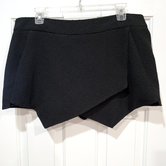 These are a pair of dressy Kensie polyester / spandex blend skort. Really cute and comfortable! Satiny on the inside, and has a pebbled softened satin/silk texture on the outside. Great with heels or with fun tights for a night out!
