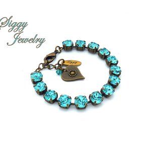 Genuine Swarovski light turquoise tiffany blue crystals shimmer brilliantly in this charming tennis bracelet that is bright, sparkly, versatile and perfect for every occasion. You won't want to take it off.
