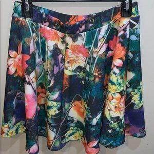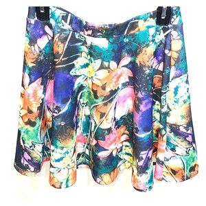 Colorful and vibrant and totally unique this skirt is the perfect statement piece! It’s polyester/spandex blend make it very stretchy and comfortable as well. I’m wonderful condition only one thing to point out would be stitching in tag is loose on one side. This is the label on the inside of the skirt so absolutely no flaws visible