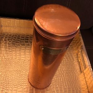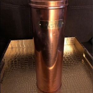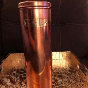 Rustic Copper Pasta Canister with Brass Tag. Vintage canister a bit shabby and tarnished which is a part of the charm. It stands 11" tall in rustic vintage condition with some minor tarnish and wear.