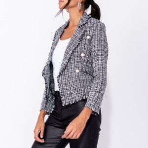 Dress it up or dress it down this will be sure to be the Dreams Tweed are made of! Our Trist Tweed Dreams Blazer features a black and white Tweed Fabric, Gold Pearl Button Closure, in a tailored fit. Pair with our black pencil skirt for that boss babe look or your favorite denim for a casual weekend look.