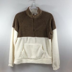 Fleece pull on long sleeve pull on jacket. Very warm and snuggly soft. Gently worn once. Like new in excellent condition. In a milk chocolate brown and cream color with front neck zipper. Youth size L.