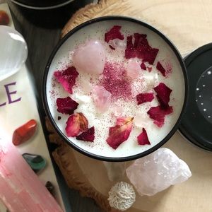 This beautiful Soy Wax Candle is so pretty and smells phenomenal! Featuring notes of Rose, Ylang Ylang and Vanilla Essential Oils. Dressed with a Rose Quartz Worry Stone and Rose Quartz Crystal Chips. Topped with Pink Rose Petals and pink sparkle!!