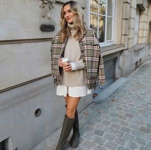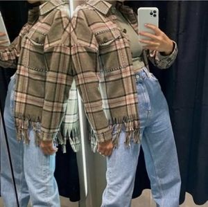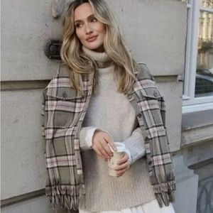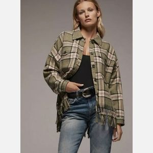 Collared overshirt made of a wool blend. Sleeves falling below the elbow with cuffs. Front flap pockets. Fringing along the hem. Metal stud details.