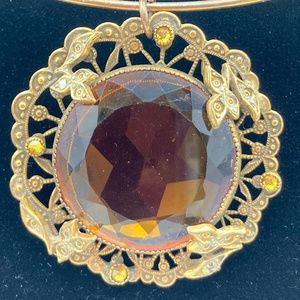 Vintage brass and amber glass pendant. Intricate floral design with gem detail on mount. Large faceted amber glass center piece, eye catching. 1 & 3/4 inches wide. Excellent pre-owned condition, no flaws, smoke free home.