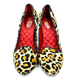 Beautiful calf hair pattern, stacked heel, loafer design. 3½" heel. ½" internal platform.3" wide across bottom. Size 8½.