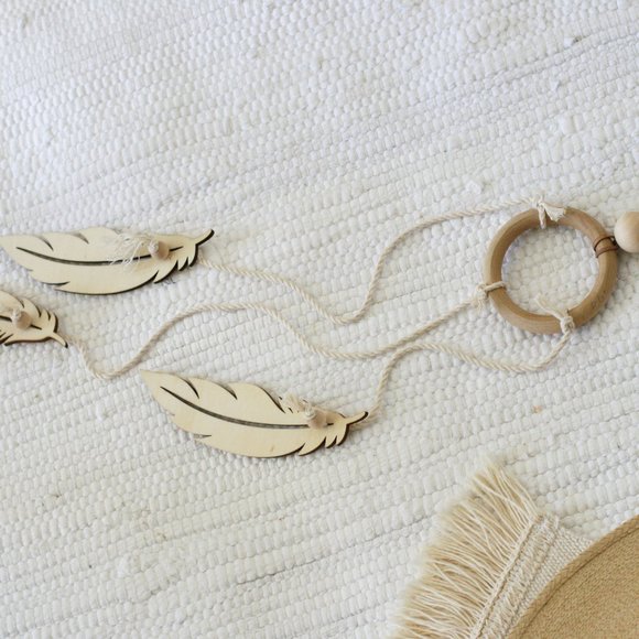 Boho dream catcher made with cut wood feather cutouts.