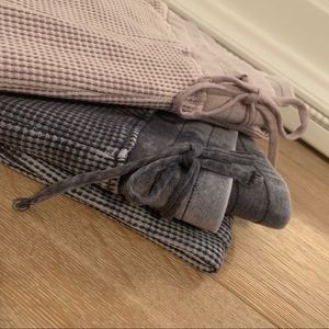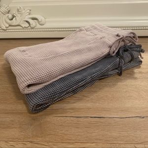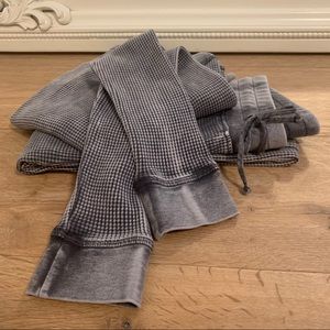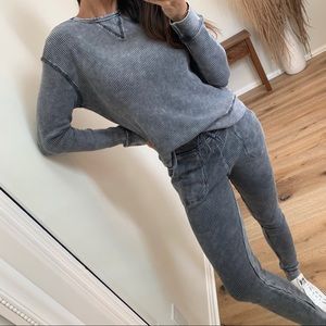 I can’t get over how cute this is on. I love it worn as a set or by itself. Slimming style waffle pattern that is a gorgeous mineral wash color. True to size & can be sized up easily for a looser look. Very high quality, medium weight and durable. Pockets, adjustable waist, can be worn high waisted or mid-rise.