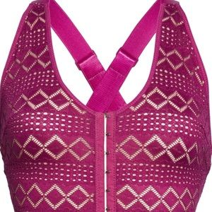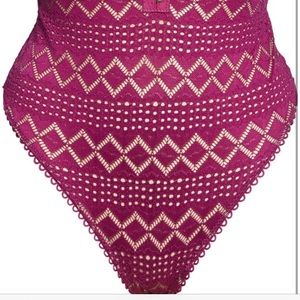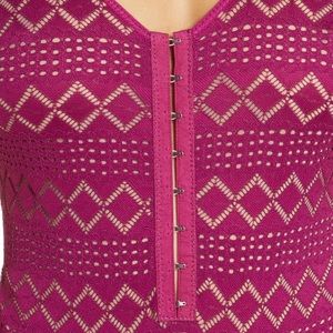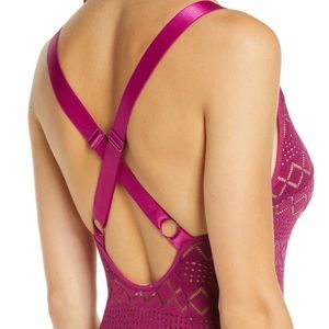 Make your night extra saucy in a stretchy, laser-cut geo-patterned teddy with an alluring front hook-and-eye placket and strappy, crisscrossing back.
