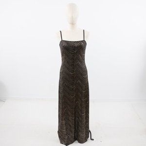 Rare luxury designer St. John elegant sparkling knit evening gown. Long straight w stretch & thin straps. Modern art deco vibes w scalloped stripes of gold embellishment & rhinestones. Flattering Hollywood glam maxi for galas or New Years Eve party! EUC.