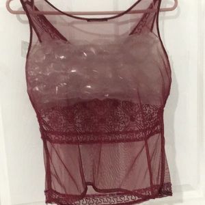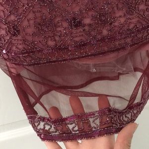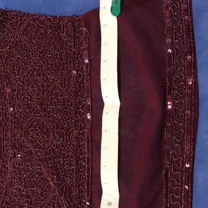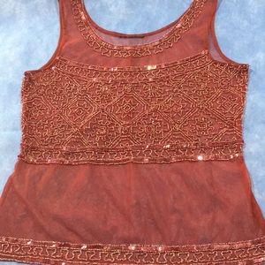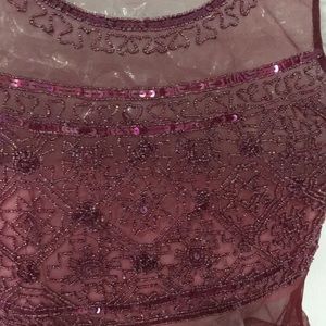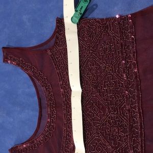 (Buy Niw $10) Ladies Top. Sheer/see through Maroon colored fabric, embellished with sequins and beads around the neckline, front and bottom waistline. Size S (can fit 6-8 slim, see measurements). Use it to layer on any shirt or long sleeved shirt.