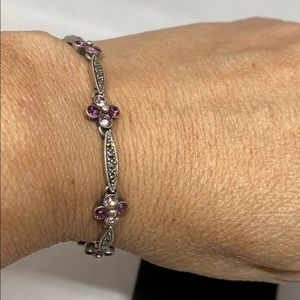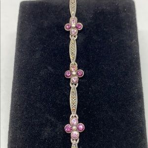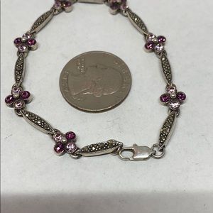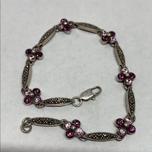 Beautiful and delicate sterling bracelet with alternating links of marcasites and 4 sided flowers made of light and dark round faux amethysts. 7 1/2” long. Marked 925 on clasp. In good condition, slight wear, noticeable under magnification.