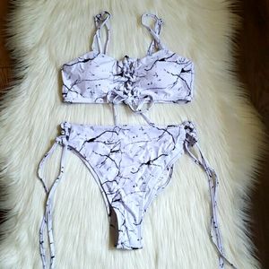 Marble Lace-up Bandeau Top Highwaisted Bikini Set