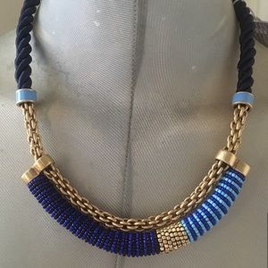 Hand beaded blue hues and gold suspended by a beautiful vintage gold chain with enamel details and backed by navy rope. An easy collar for any outfit. Classical elegance!