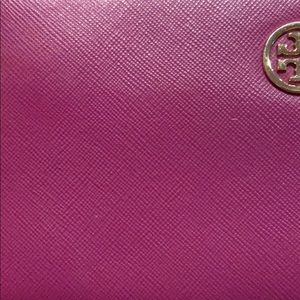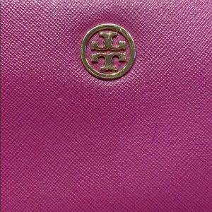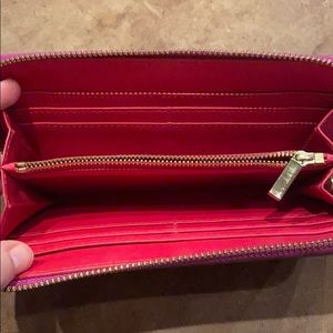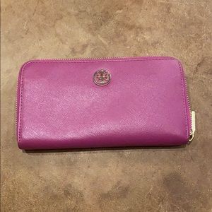 Tory Burch Purple Wallet. Gold accents. Red interior. 8 credit card slots. Great interior condition. Ink stain exterior visible in pictures. Great size and vibrant colors!