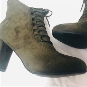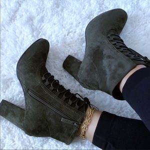 Olive vegan suede round toe lace up with side zip closure. Padded footbed, chunky heel approx. 3.25”