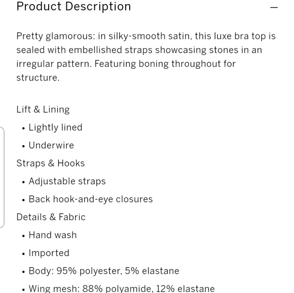 Lightly lined bra top. Boning for structure. Adjustable straps. Straps have stones in an irregular pattern. Back hook eye closure. COORDINATING PANTY OFFERED IN ANOTHER LISTING IN MY CLOSET. PLEASE BUNDLE FOR DISCOUNT. ๐๐