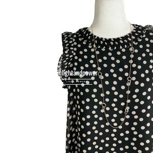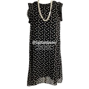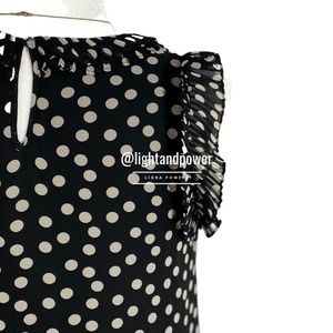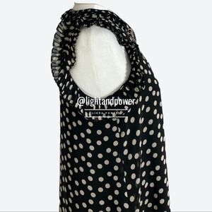Pretty sleeveless black and white polka dot dress with elegant ruffles at neckline and arms. Pretty keyhole at back with hook and eye closure. Gauzy fabric drapes over and moves with the body. Elegance at a great price point!