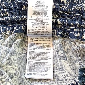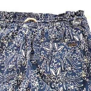 Roxy Oceanside Flared Beach pant. Size M, blue and white floral print pants. Linen viscose blend. Front and back pockets, rope drawstring with a peek-a-boo back and elastic waistband. Waist is 14in laid flat, unstretched. Rise is 9in. Inseam is 30in. Perfect never worn condition, just tags have been removed.