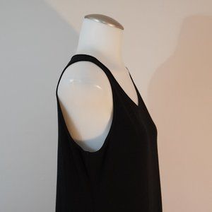 Cool minimalist, shapeless silhouette. Fits true to size but still roomy. Dress is stretchy and comfortable. Black in color. Sleeveless. Size small.