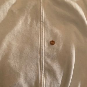 White VS PINK hoodie with logo, pockets, hood, full zipper, arm stripes, size large, this is in good used condition. I discovered a tiny stain on it when folding it up as shown in last 2 pictures. It doesn't show when it is worn. Minor pilling.
