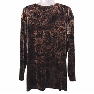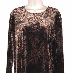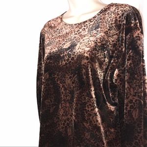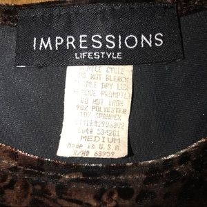 Beautiful Vintage leopard roses plush velour top! 😍Impressions Lifestyle Label, Size Medium but in today’s sizing should be an XL, see bust measurement. Polyester/spandex blend. Made in USA. Good preowned condition and nice quality top!