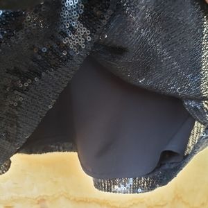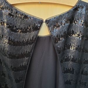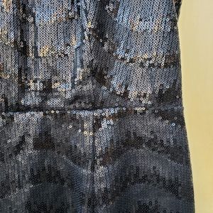 Gorgeous BCBGMaxAzria sleeveless black "Nera" sequin cocktail / occasion open back dress. Size 10. Wavy pattern of 2 tone black sequins on a sheer layer of fabric - lots of sparkle!! ... Is fully lined. Features an open back with loop & button neck closure and hidden back zipper. Fabric is 100% polyester. EUC, looks brand new!! ... Comes from a non-smoking home.