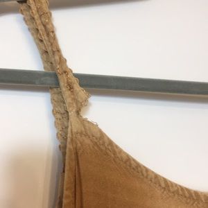 A beautiful vintage dress! Made of very soft and almost silky rayon. Tie back. Lots of red, green, and silky tan embroidery. Some fraying around the edges of bottom patches, and one strap that needs easy mending - see pics