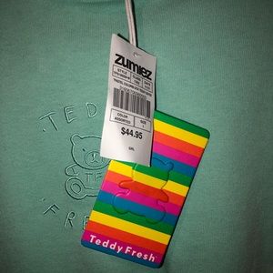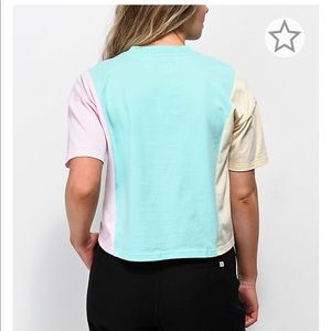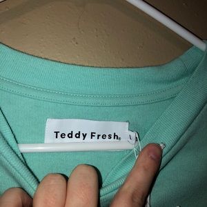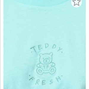 Brand new with tags Teddy Fresh women’s size large Pastel Colorblock Teddy Crop T-shirt. This cropped, boxy fit tee features a pastel yellow, mint green, and light pink colorblocked design, and features an embroidered Teddy Fresh logo at the chest. Made of 100% cotton. Very small mark on front was there when came in mail but most likely will go away when washed. This size will fit a 36-38.5 inch bust, 31.5-32.5 inch waist.