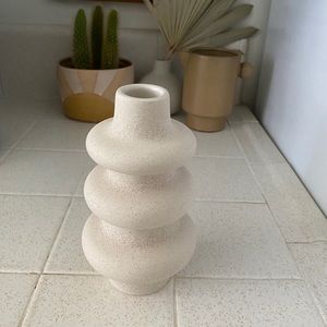 Small vase in glazed ceramic. Inner diameter at top approx. 1 inch, diameter at widest point approx 3 1/2 inches, height approx 6 1/4 inch