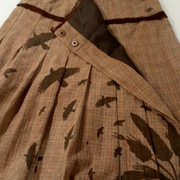 This is a vintage inspired Industry pleated full A line skirt. Well constructed with flying birds. Its is knee length, with flannel material, polyester wool. Has a snap button closure. Super cute, perfect for any occasion. Size is small. Lined up bottom with lace.