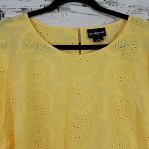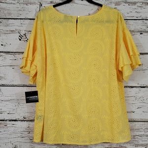 NWT - Liz Claiborne yellow short sleeve top. Crochet pattern with rounded neck. Ruffle sleeve is flattering. Back neck has gold button closure. Size 1X.