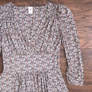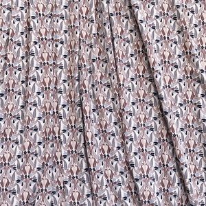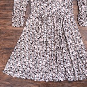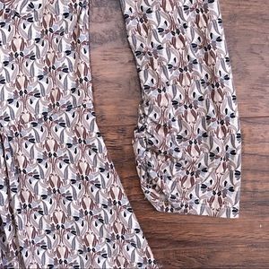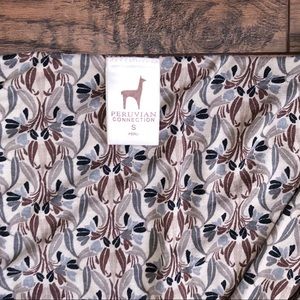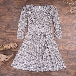 *SOLD* Gorgeous vintage inspired jersey knit dress by Peruvian Connection. “Lana” style in beige with a grey, taupe, and brown leaf print. 1940s-inspired styling with puffed shoulders, gathered bust, and full swingy skirt. So figure-flattering & comfortable! Viscose / spandex blend fabric. Size S, excellent preowned condition.