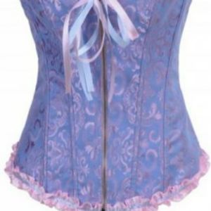 Smooth lavender jacquard corset with pink & blue embellishments, ruffles & bow ribbons.it has a typical corset lace up back & a front zipper.super stunning!.