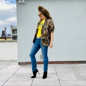 Vintage by Jordana Unique Animal Graphic Gold Button Down front Shirt Blazer Jacket Pop shoulders side Patch Cargo pockets Multicolor Warm Floral Safari Animalistic Jungle Theme, Partially lined, pop 80s padded lined shoulders, tapered silhouette, cuffed buttoned tapered long sleeves of Shirt cut easy to roll up, Fabric has a cotton feel and texture of short trimmed vegan micro fur, interesting designer's idea one of a kind vintage piece, and perfectly adapted to pomp and circumstance! Top for Women Men Unisex, might be handmade one of a kind.