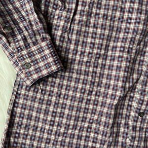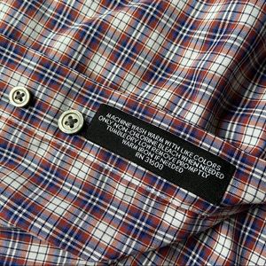 This shirt would be perfect as business attire or worn to any formal event! All over plaid check patter with full front button closure. Crisp collar with button cuffs. Includes two spare buttons. Tailored fit. Men’s size large.