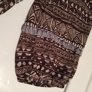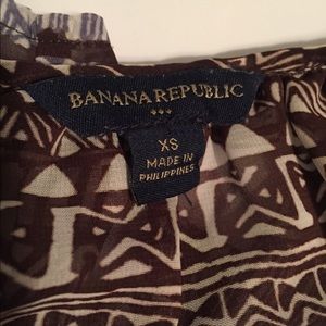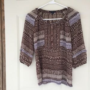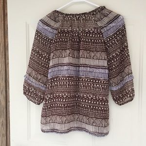 Banana Republic Factory tribal print brown and cream blouse. Very flowy and light with 5 buttons on the front and a delicate ruffle around the neckline. 3/4 length sleeves have one row of ruffles in contrasting print. All these details are visible if you zoom in on the photos. Excellent condition.