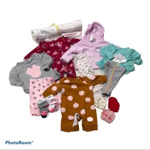 5 outfits 1 pack of socks 3 pair of mittens and 2 bath towels. All of gently used and for newborn to 3 mo. Brands include old navy Disney Carter etc...
