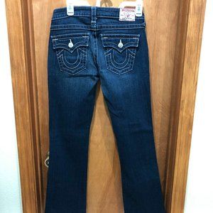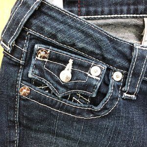 Very good condition. Size 4 (27-inch waist). Med to dark blue, only slightly stretchy.