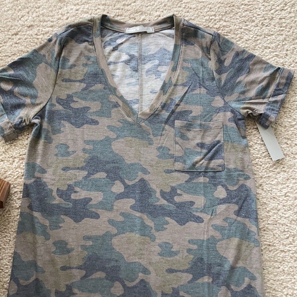 Camouflage T Shirt Dress. Super cute wardrobe staple! Short, rolled sleeves. V neck. 68 polyester 29 rayon 3 spandex. Fit is true to size. New boutique item with tag.