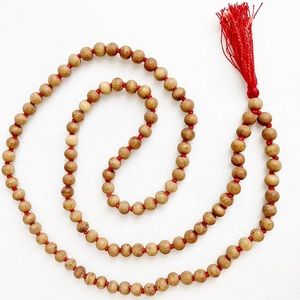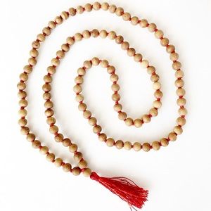 Sandalwood japa mala necklace, approx 30” in length with red tassel. Wood bead garland is hand strung with each bead individually knotted. 108 beads + 1 additional guru bead for a traditional Indian japa mala for mantra chanting, bhakti yoga, and spiritual presence in the home. Fragrant sandalwood beads. Lovely sacred holiday gift for spiritual friends!