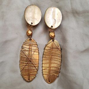 These brushed gold clip on earrings each have a hammered metal oval with a copper bead that connects to the dangling wire wrapped oval