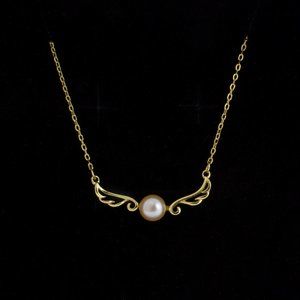 This is a beautiful necklace with a very pretty pearl in the middle. On the sides are wings. It is solid sterling silver, including the chain, and is plated in 18K gold.