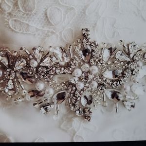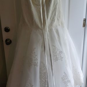 Stunning and elegant. Size 20 but can fit down to size 18. Only worn for four hours(ceremony&pictures), has built in bra for convenience and comes with a slip.