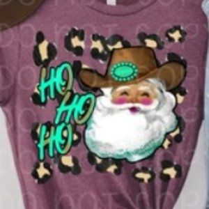 Handmade screen on a new t-shirt. Faded red fashion t-shirt with a Cowboy Santa "Ho, Ho, Ho" design. Design also available on a white shirt.